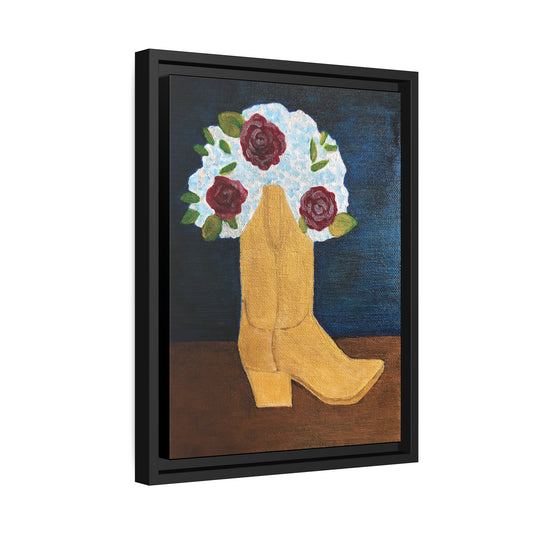 "Boot Bouquet" by Yvonne Blacker printed on matte canvas with black frame