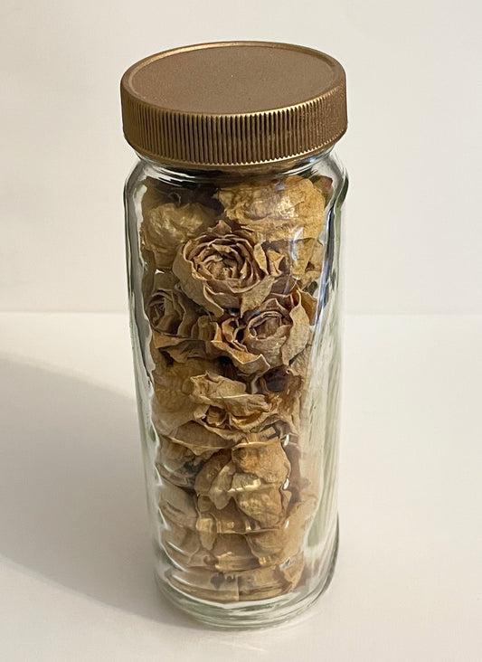 Boho Style Dried Golden Blush Rosebuds and Petals in Glass Honey Jar with Copper Gold Spray Painted Lid