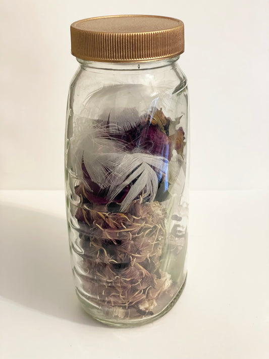 Honey Jar with Burgandy Rosebuds, Mixed Florals, and White Pekin Duck Down Feathers