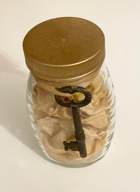 Small Honey Jar with Dried Rose Petals and Vintage Skeleton Key