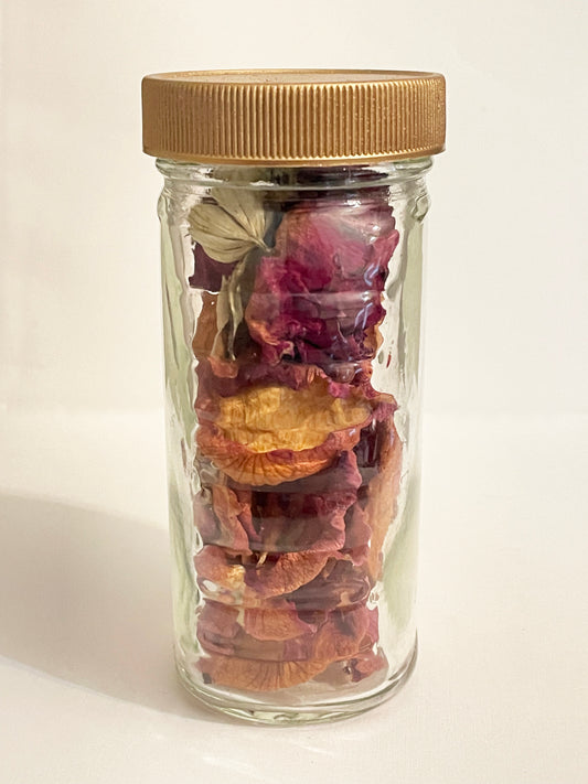Small Honey Jar with Warm Multi Colored Dried Roses and Astrantia Blossoms