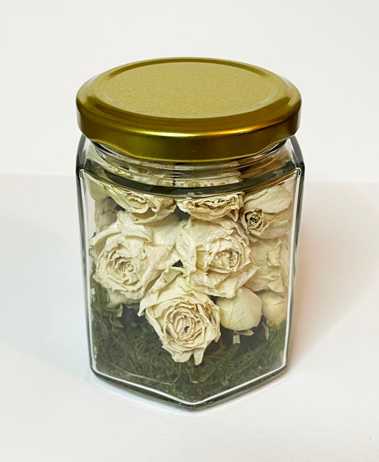 Set of 3: Dried Roses in Honeycomb Shaped Glass Jars with Gold Lids